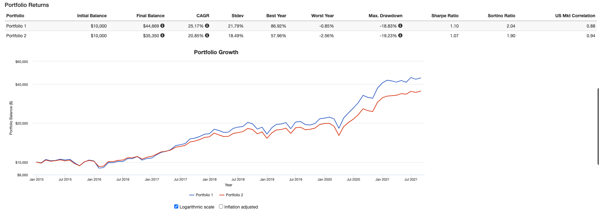 당연히 비트코인을 포함하지 않았으니 상대적 낙폭 (MDD)는 반으로 줄어 들었습니다만 수익률 (CAGAR)가 비트코인을 포함한 포트는 연평균 수익률 100%였다면 20-25% 하네요.